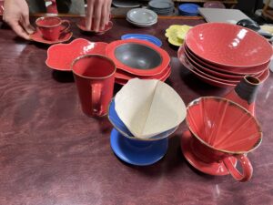 青や赤のコーヒードリッパー。