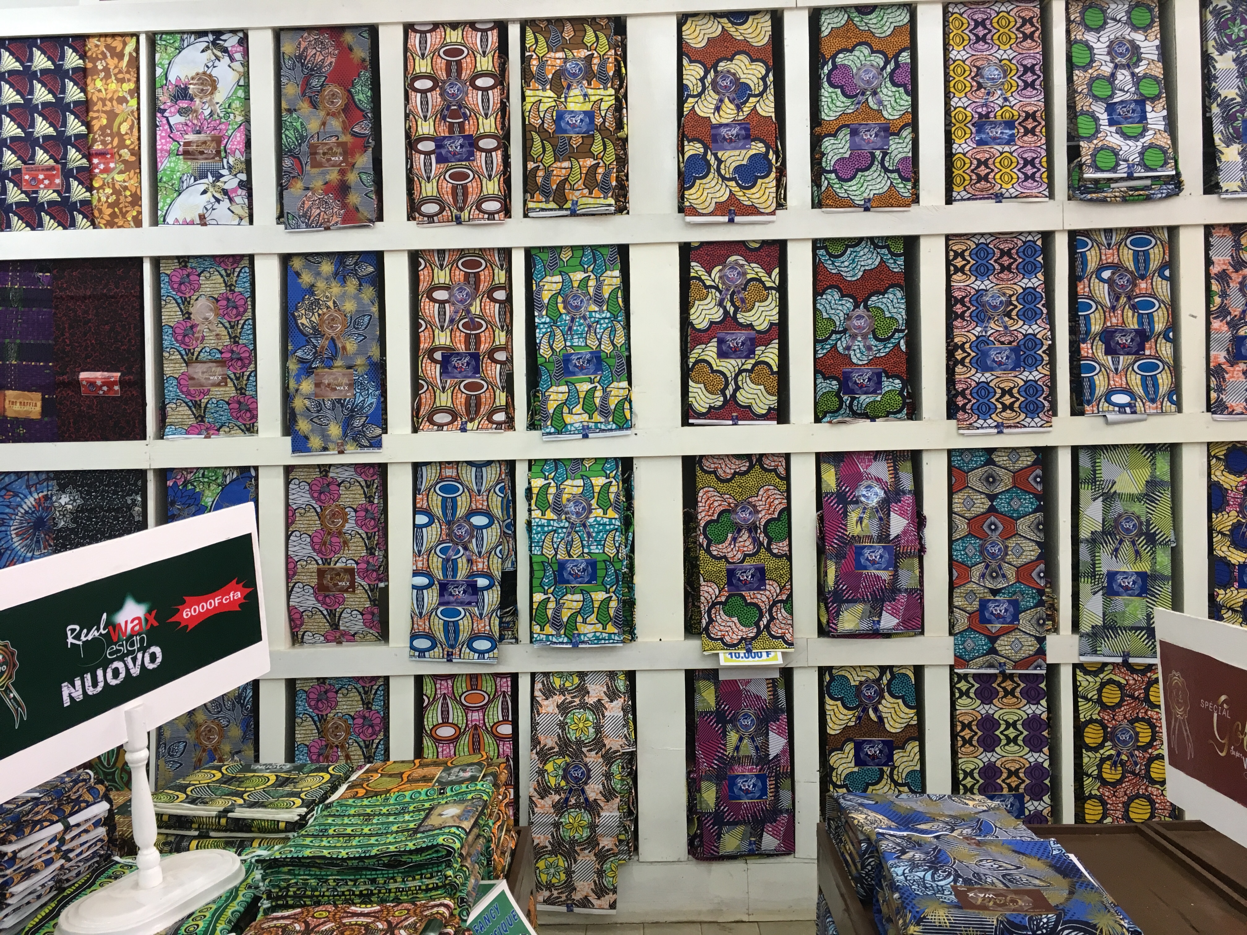私が訪問したYaoundeにある高級な雰囲気の布屋さんでは、オランダ VLISCO社のSUPER WAX BLOCK PRINTSと印刷したラベルが貼ってある布が沢山あり、どれも素敵なものでした。綿の布にワックス加工がされていて、ハリがあります。デザインは布の両面に印刷されています。