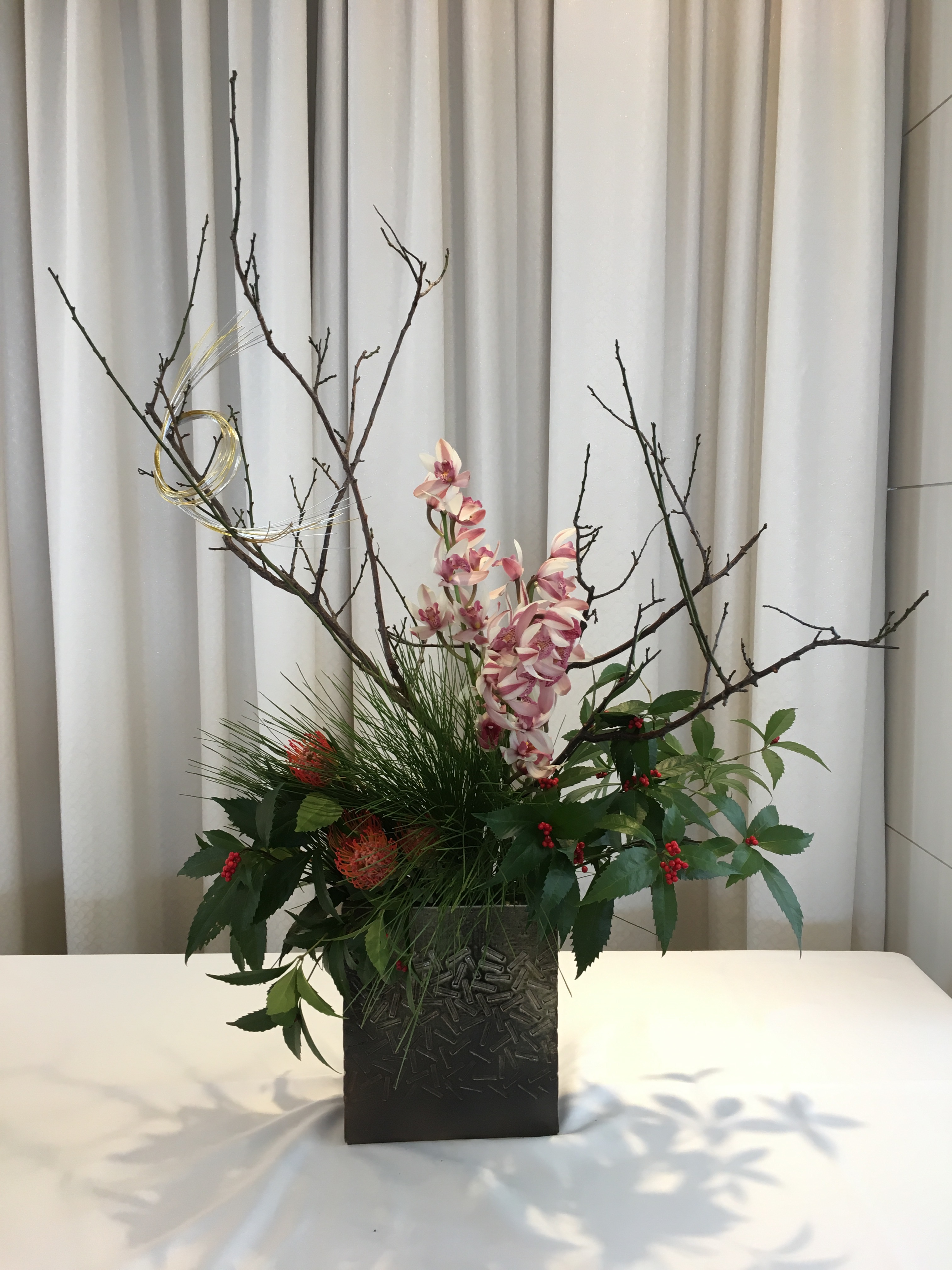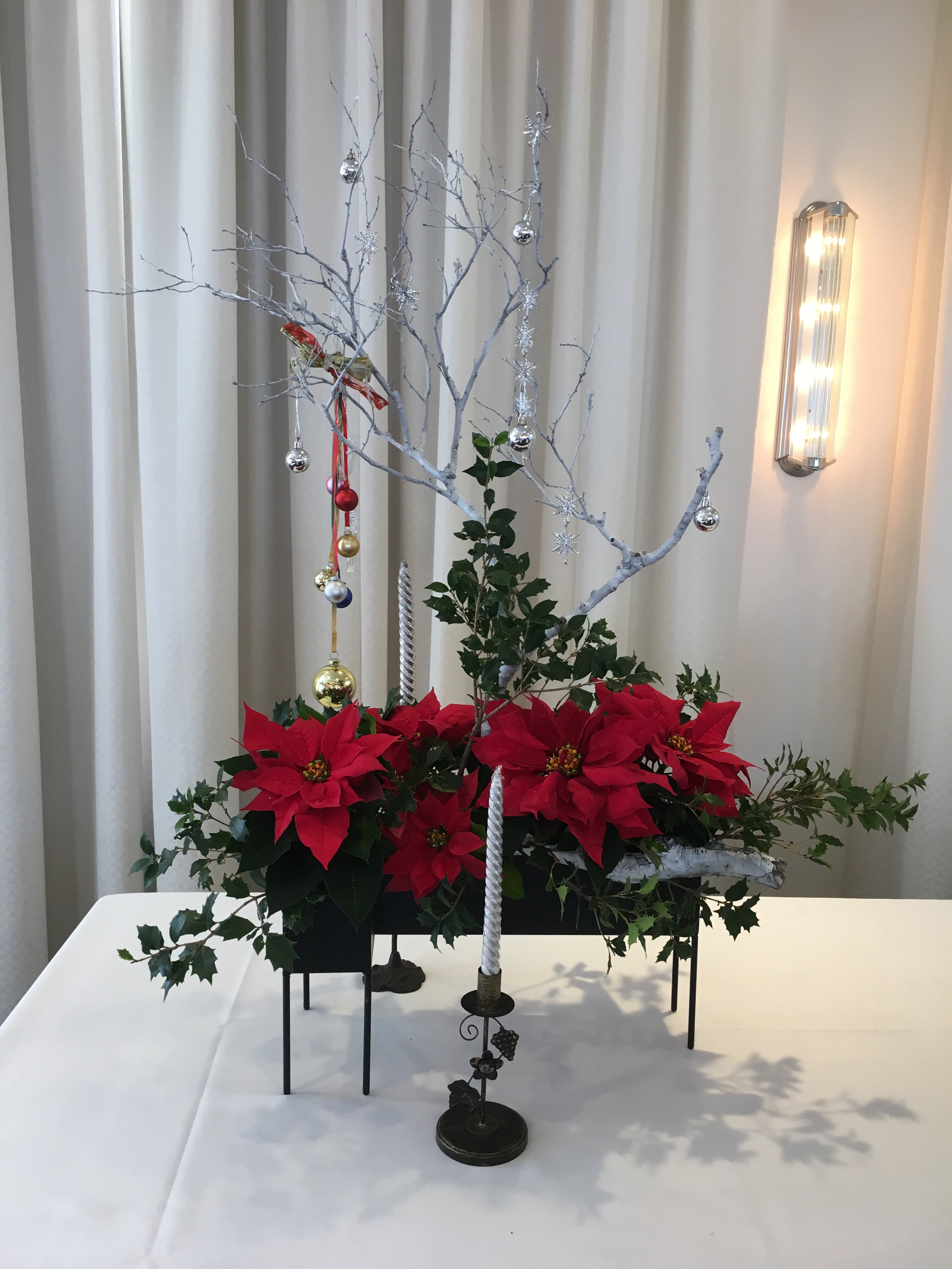 クリスマスらしいポインセチアと柊を使った作品は、柊の棘でポインセチアを傷つかない位置にポインセチアを配置することに心配りをされたそうです。 流派の違うお二人のコラボです。
