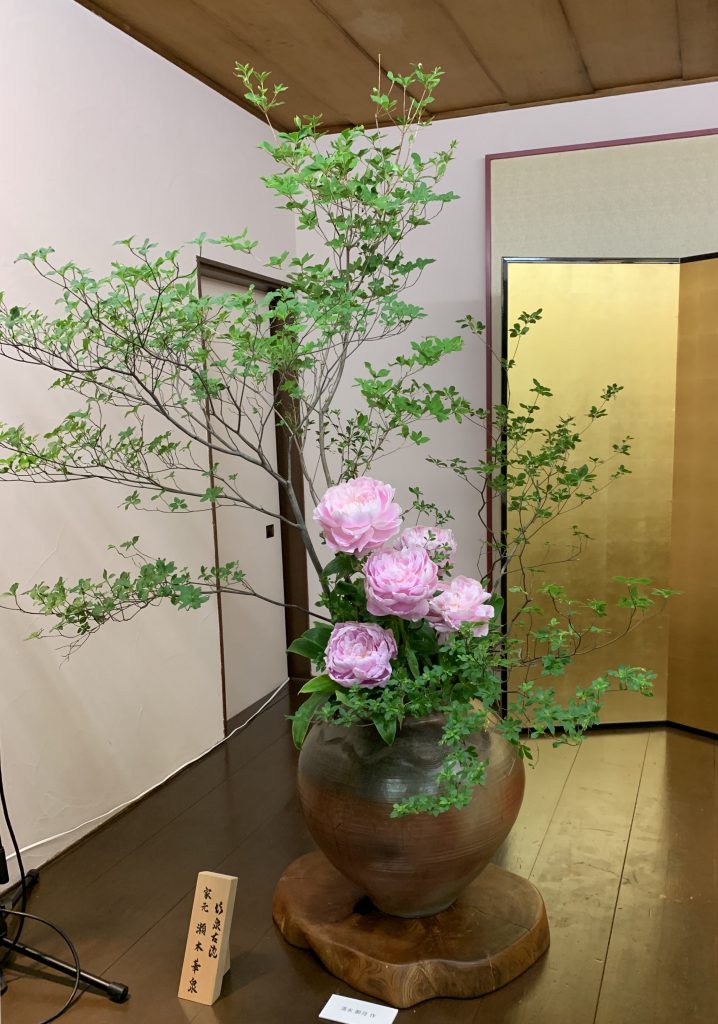 料理界の巨匠、熊谷喜八氏のフランス料理と、陶芸界(萬古焼)の名工、清水酔月氏の器のコラボの食事会が、国の登録有形文化財、三重県四日市の元紡績王の邸宅、「伝七邸」で行われ、華道の私の師匠、竹泉古流の家元、瀬木華泉氏が清水酔月氏はじめ、ご子息たちの潤、潮さんの器に花を生けられました。