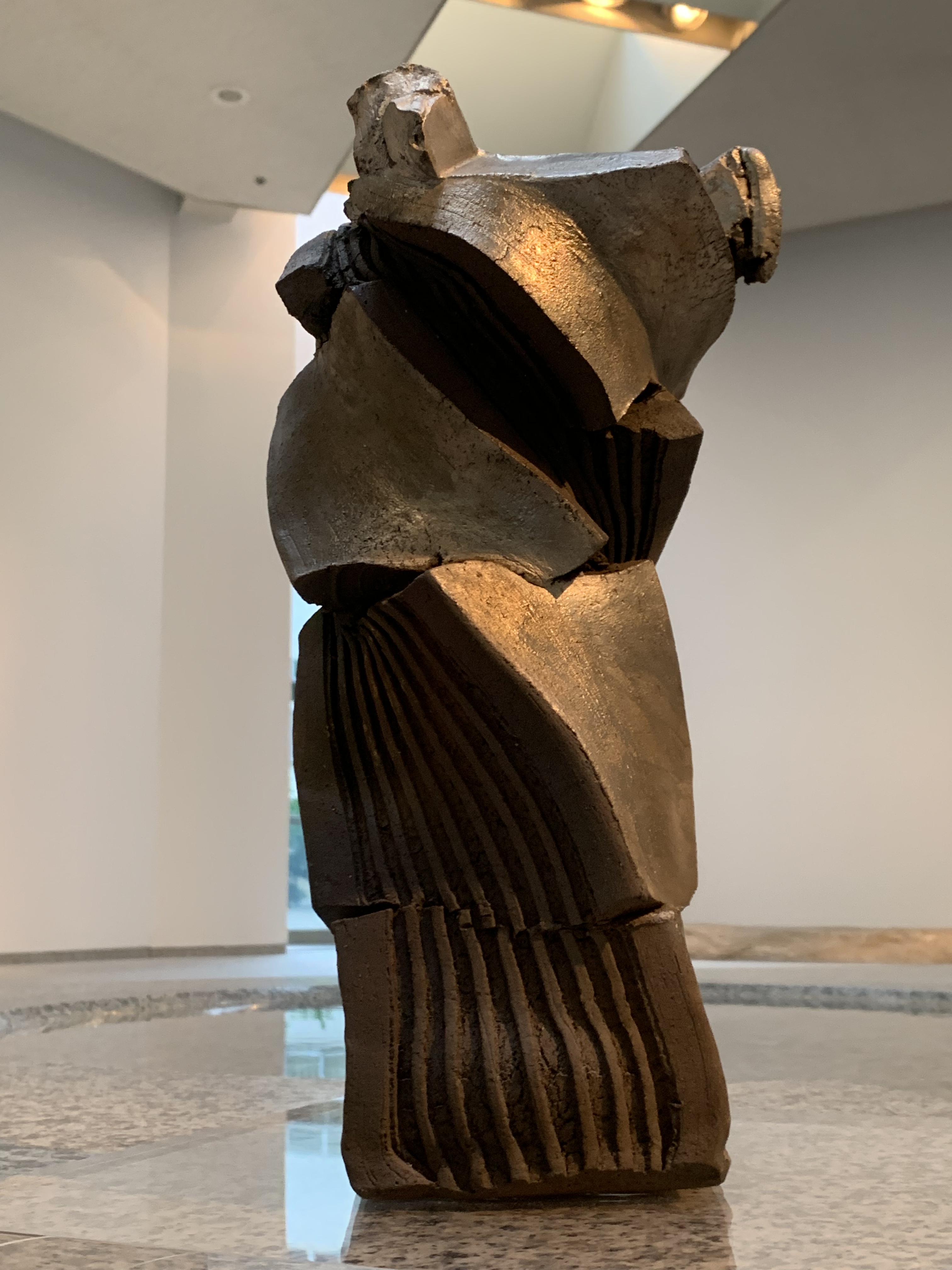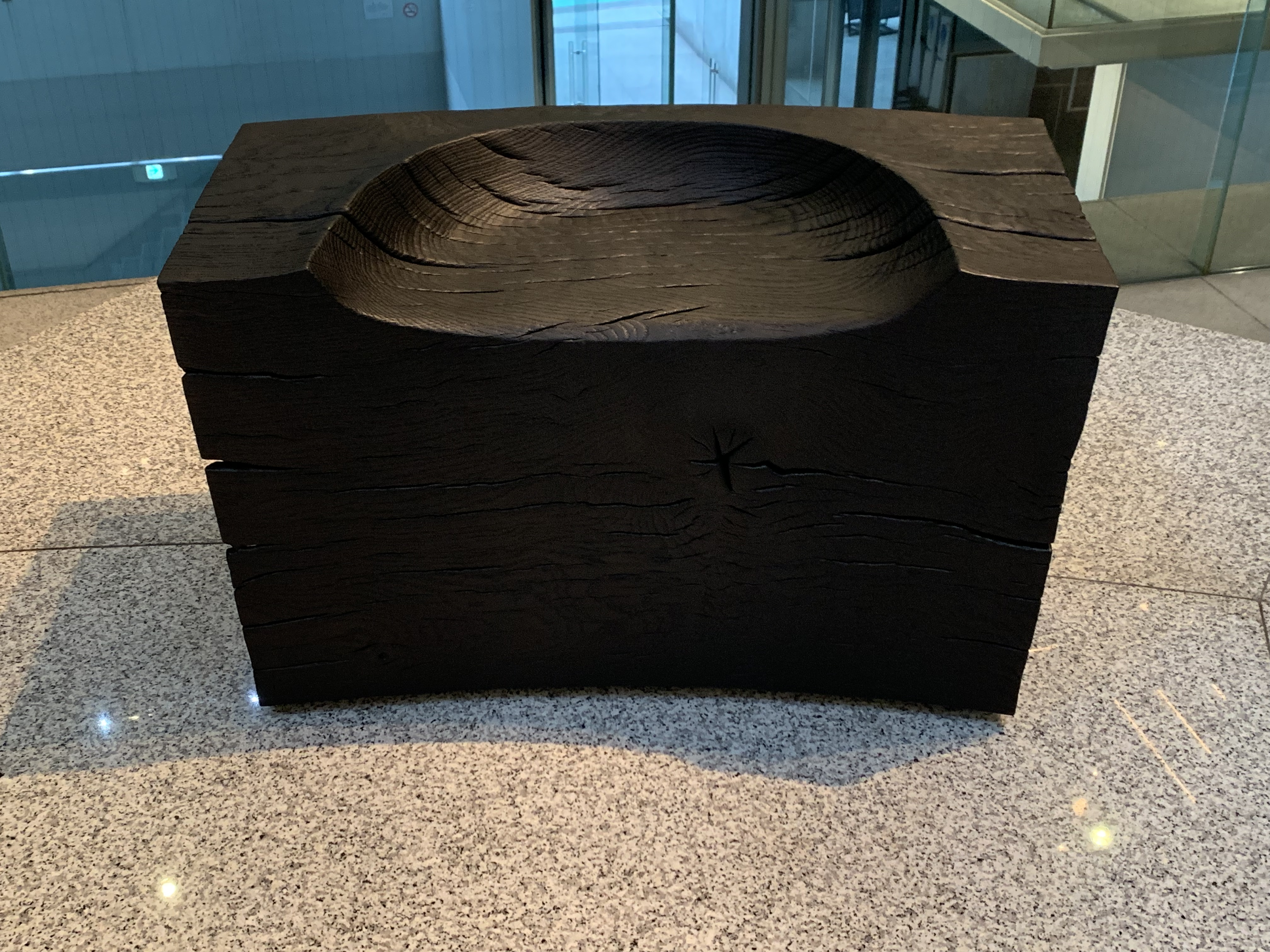 陶芸作品ではありませんが、とても存在感があって、私の目を一番引きつけたのはこの黒い木の椅子です。木の塊でありながら、温かさも感じました。