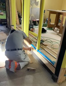 作業台の上でカンナをかけた板を設置現場にはめてみて、再度その場で板にカンナをかけて、綺麗に収まるまで微調整。収まったら固定。